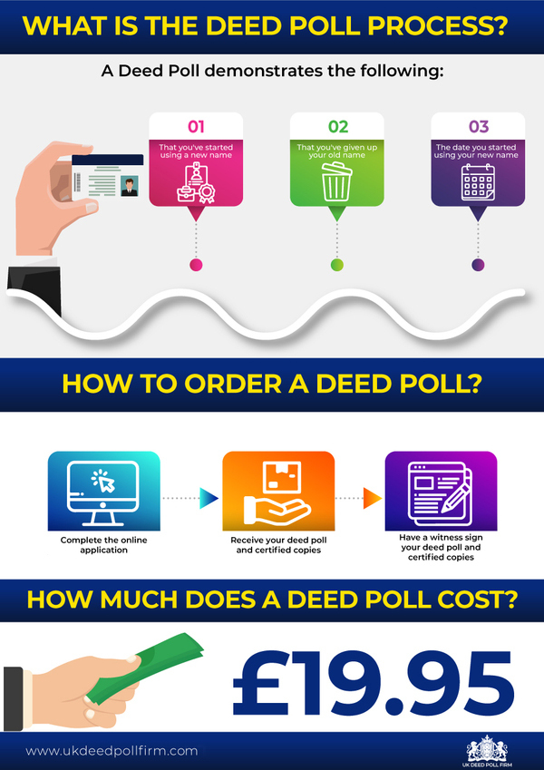 A deed poll is kind of an official legal document which enables you to officially change any part of your (or your child’s) name: you can add a new name, remove an existing name, change the spelling of your names, or even adopt a completely new name altogether, the choice is entirely yours.